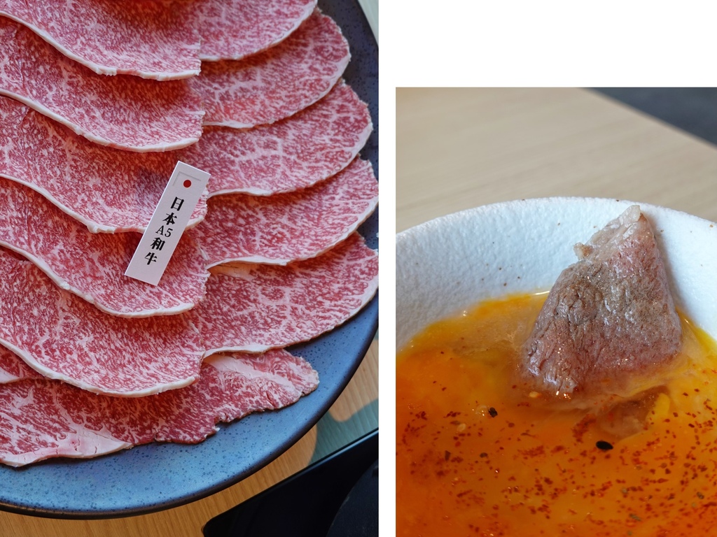 牛的部分,則是奢侈的選擇了精選日本A5和牛,選用宮崎牛的沙朗部位,油花分布均勻且肉質軟嫩,僅需涮至3-5分熟即可沾取蛋液食用。