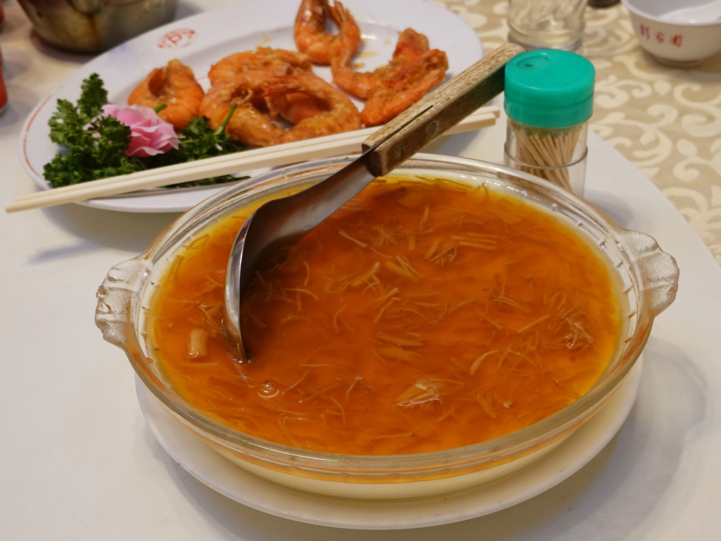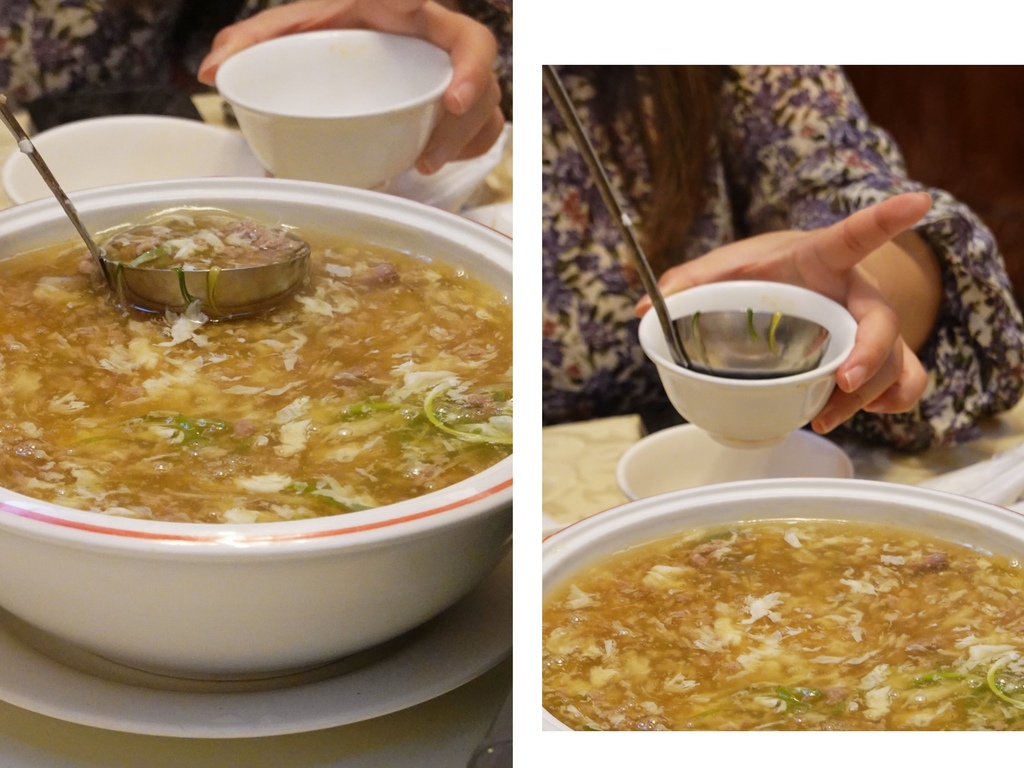 我們一桌十餘人都是首次品嘗這道羹湯,材料主要有牛絞肉、香菇丁和蛋白,口感挺一致,滑順且肉嫩,帶點酸味滿特別的,只是喜好十分兩極,由於我個人口味比較清淡,所以相較於其他菜色整體我挺喜歡。