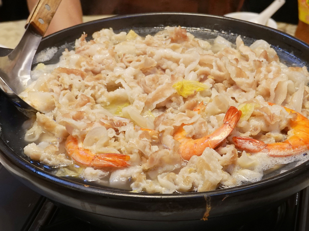 上頭鋪墊滿滿肉片跟鮮蝦的酸菜白肉鍋,跟印象中的樣貌有所差異。