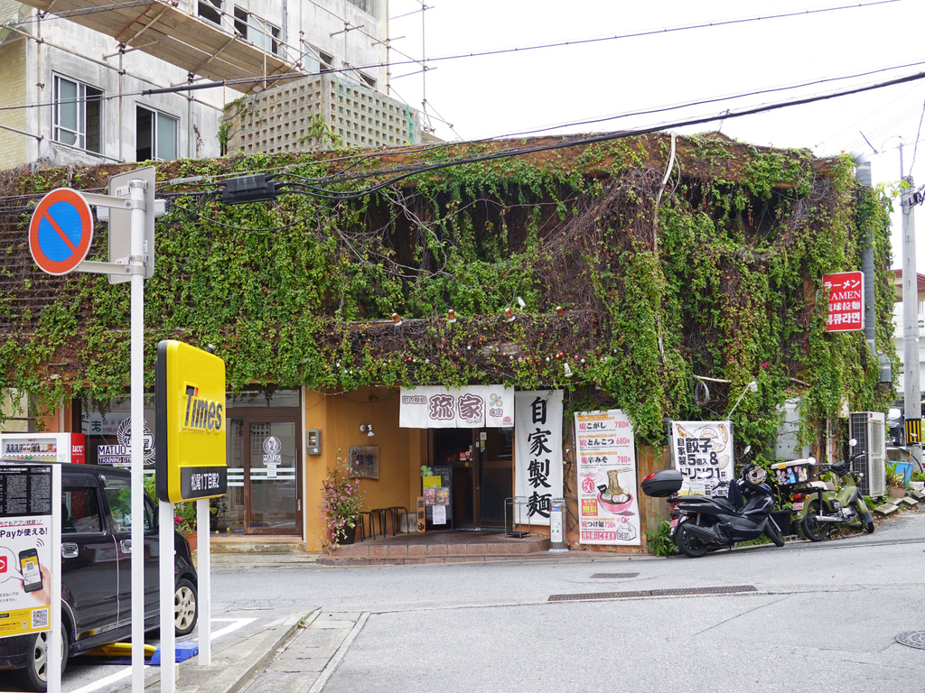 最後一天要上飛機前,跟家人到那霸國際通買伴手禮、紀念品,恰巧逛累了「琉家拉麵」就在不遠處,被藤蔓包圍的建築,及門口白底黑字的“自家製麵”,並不難辨識。