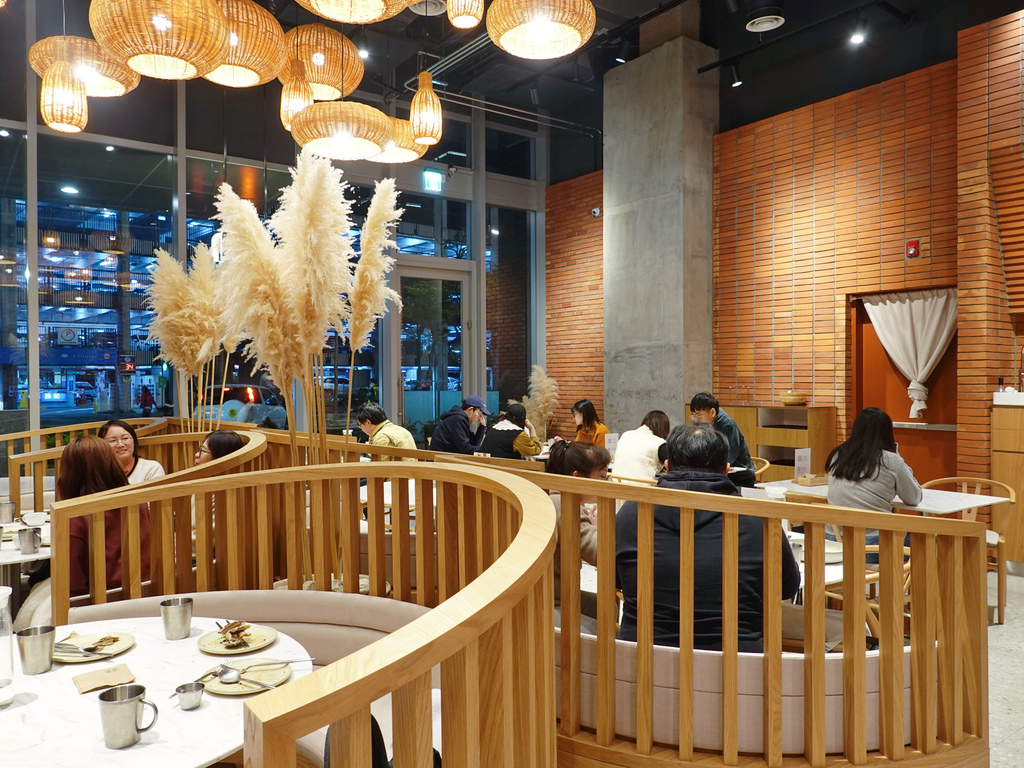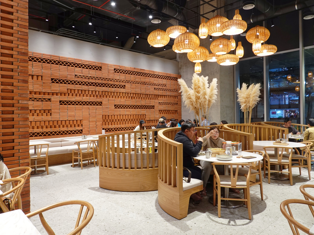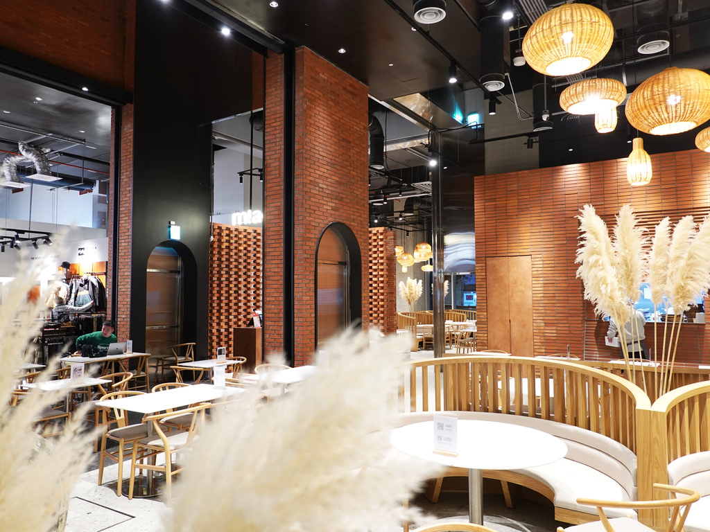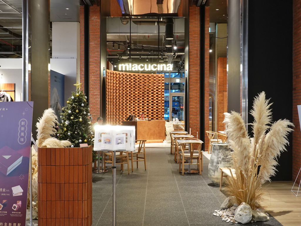 「Miacucina」裕隆城店即位於新店裕隆城一樓,半開放且挑高的用餐區域很是大氣,紅磚、芒草與木頭的元素,呈現出很溫暖舒適的用餐空間。