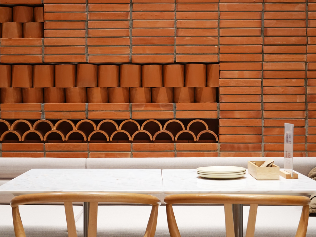 除了帶來豐富多樣且美味的蔬食料理外,「Miacucina」裕隆城店更是攜手「SCOPE 梓椿設計」,在裝潢上大量使用高雄百年磚窯品牌「三和瓦窯」傳統紅磚,結合臺灣傳統與摩登時尚,推砌出蔬食新高度。