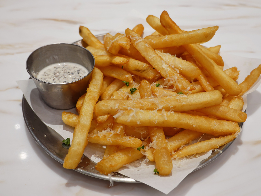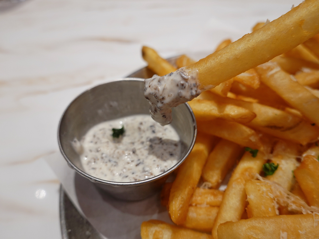 加上現炸薯條外酥內鬆軟,單吃即有淡淡的蒜香鹹香,很討人喜歡,如果喜愛濃厚口感的,沾上一大坨松露醬再一口吃下,是不會讓你失望的。