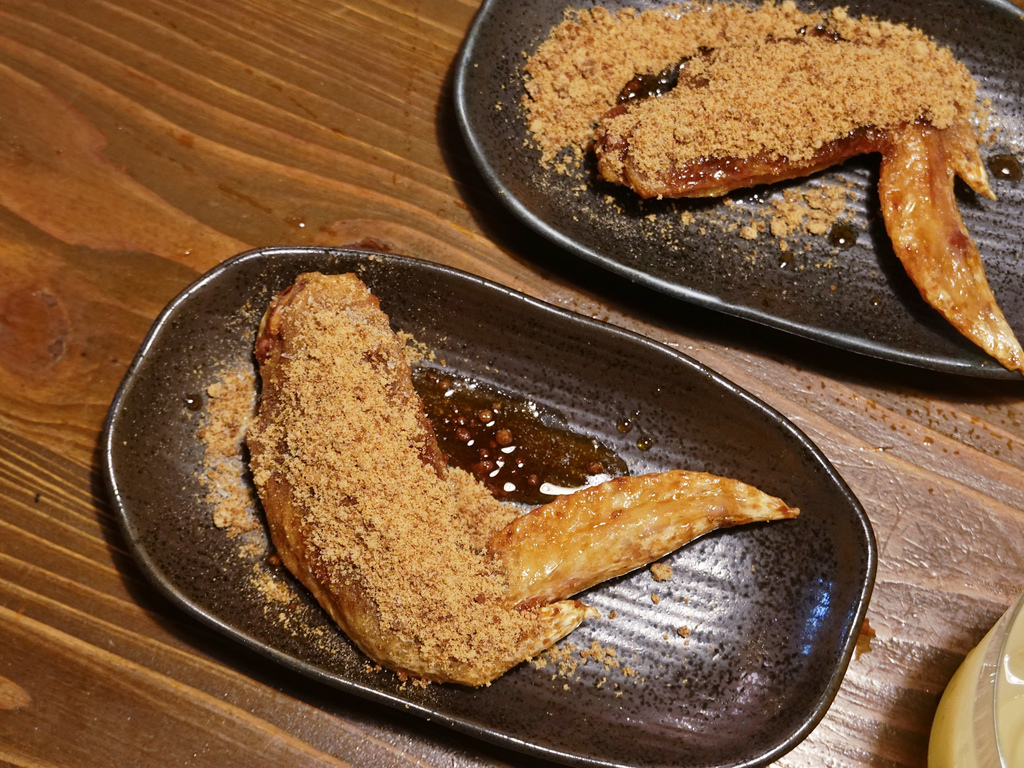 雞翅本身即刷有醬汁,與遇熱融化的黑糖形成帶有胡椒風味的照燒醬汁,甜鹹交錯的滋味很是有趣,與雞翅的油脂及滑嫩肉質十分合拍。