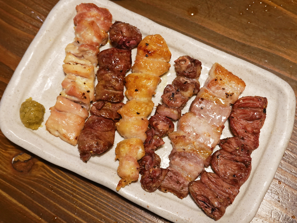 精選串燒似乎沒有固定的品項,當天我吃出來的大概是雞腿、雞肝、尾椎、雞心、豬五花、雞心管,每樣食材都烤得恰到好處。