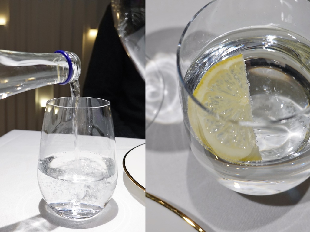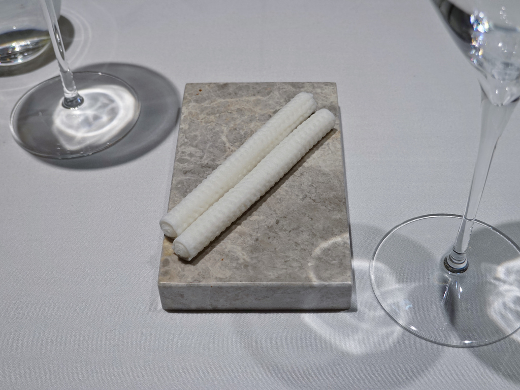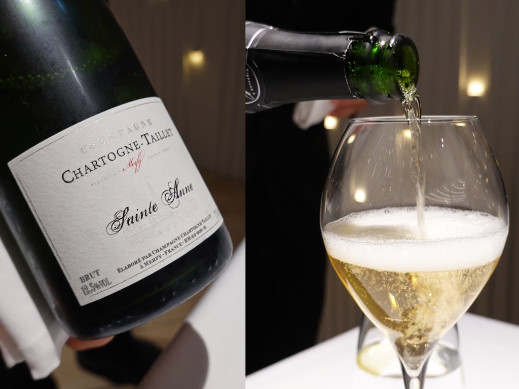 湊近杯口聞,柑橘、花香香氣明顯;酸度輕盈、細緻,加上帶有礦物般的鹹度與清脆口感,與兩道小點十分適配,是杯優雅且高級的香檳,搭餐、單喝都好。