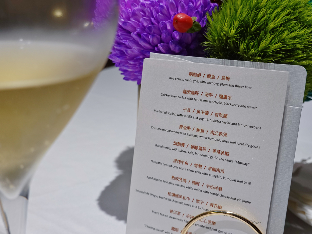 餐酒搭配,是由辜仲立先生針對每季菜單親自挑選搭配,這次的三杯套組,以香檳揭開序幕。