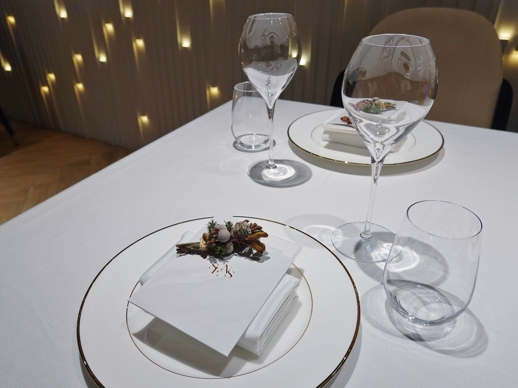 主廚Darius既遵循法式傳統,在餐桌陳設上自然也不馬虎,雙層檯布、桌面軟墊、鮮花、骨瓷餐具、水晶杯、秀盤(show plate)、扶手椅……,無一不缺。