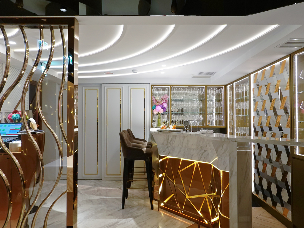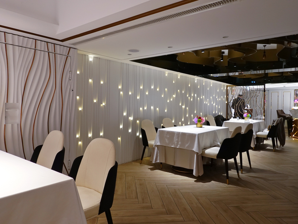 「SENS」是由老公寓改建而成,斥資逾千萬裝潢,連主廚Darius也親自參與,空間擺設典雅、舒適。店內牆面的曲線線條與天花板S型燈飾,皆是以首字母的S為裝飾核心概念。