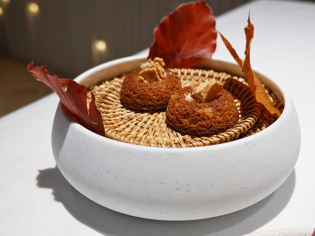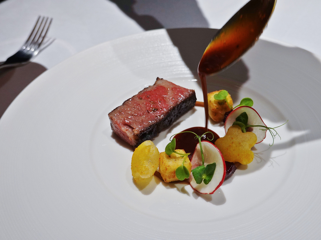選用日本與美國混種極黑和牛的牛小排部位,與青花椒、貢布胡椒製成的醬汁搭配食用,一旁還有酥炸玉米糕、栗子泥及馬鈴薯舒芙蕾,同樣拆解還原了牛排旁常見的配菜,創意度嶄露無遺。