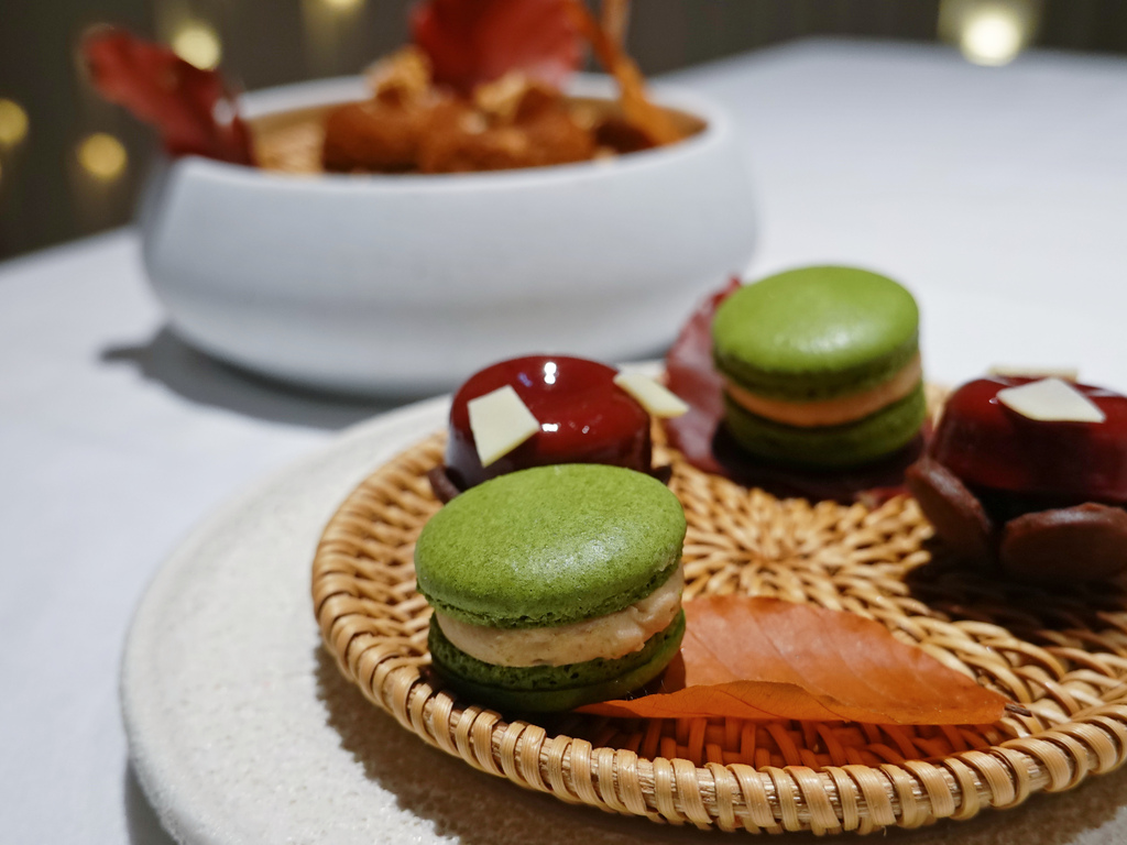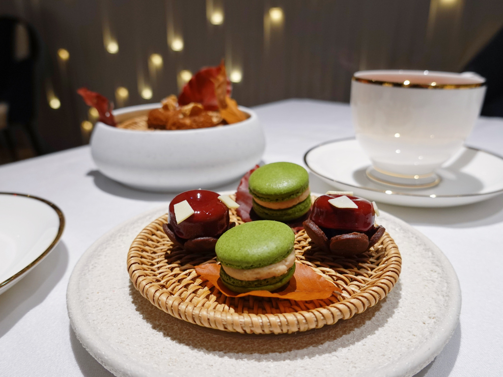 茶點有栗子紫蘇梅風味馬卡龍、黑醋栗巧克力及鹹甜風味蕎麥蛋糕,每一樣都是可以擺上菜單、單獨販售的等級。