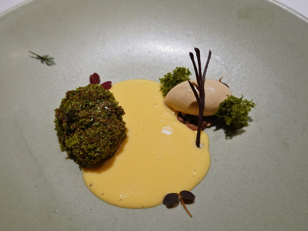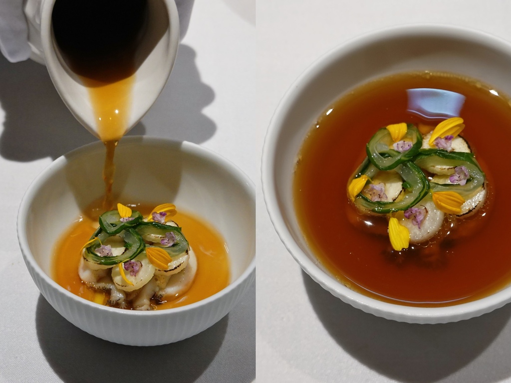 服務生緩緩地將以臺灣車輪南瓜、金桔為基底的黃澄醬汁倒入盤內,調和一旁的青花菜羅勒泥,同樣地,又是兩種醬汁結合,令我很是期待。