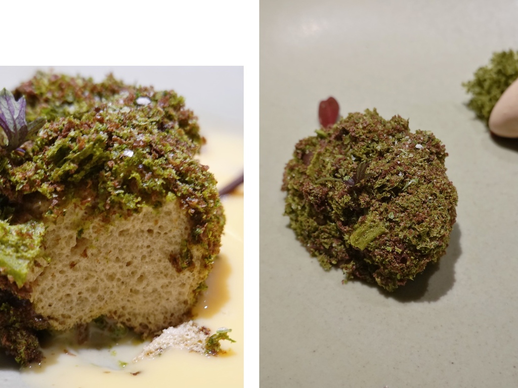 底下是雲林黑蒜蘑菇泥,既濃郁又帶有碳燒香氣;一旁的綠色醬汁,則是法式經典五大醬汁之一-莫內醬。