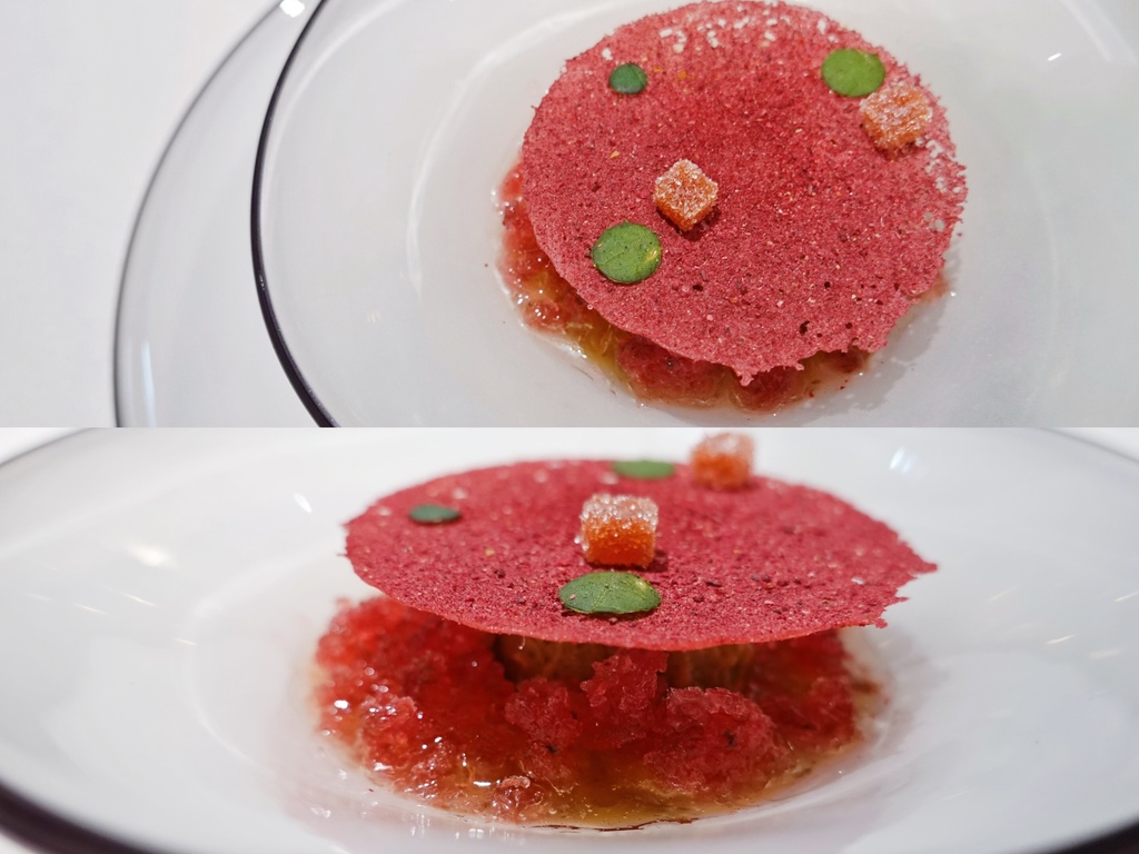 這道小點呈現方式讓我想到「RAW」2020年,以酸和醃漬風乾手法呈現後疫情時代保存食概念夏季菜單,但卻更為完整。