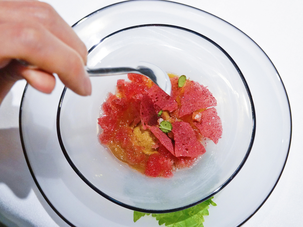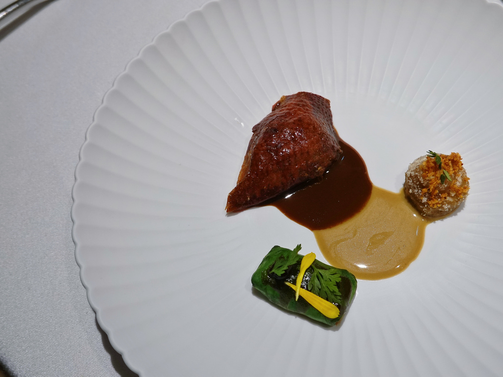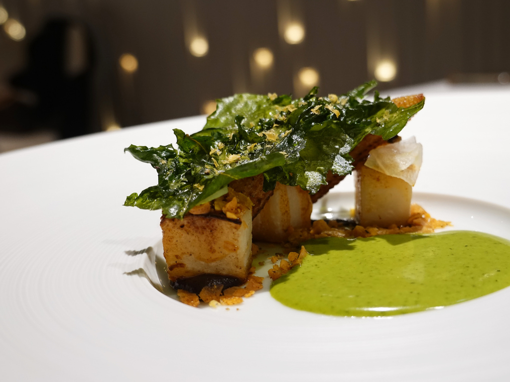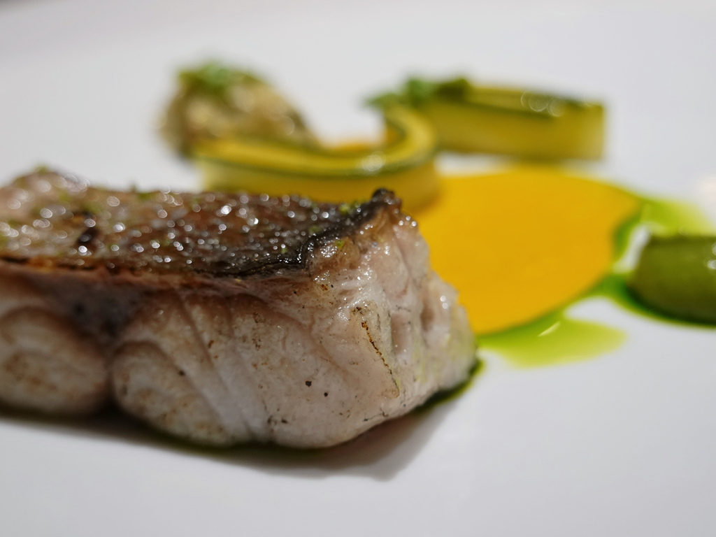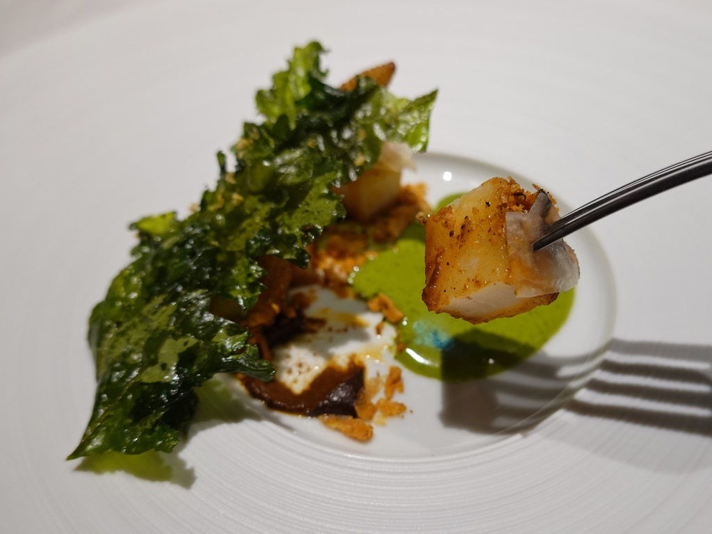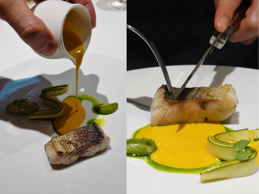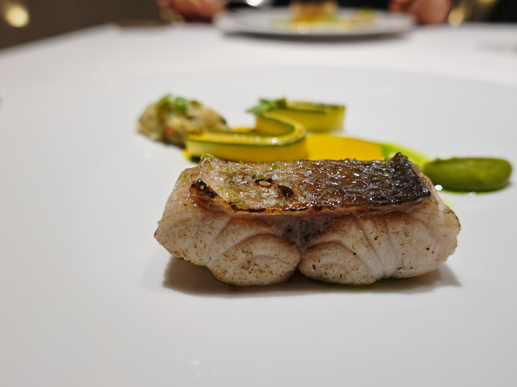 魚肉幾近入口即化,而醃漬櫛瓜的酸度與兩種蔬菜為底的醬汁,和午魚完美結合,達到醬與食材合一的最高境界,不愧是身為米其林一星主廚的深厚功力。