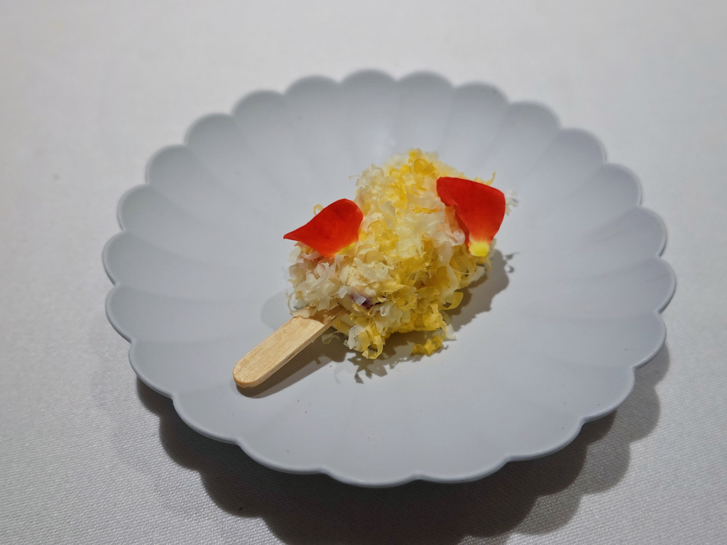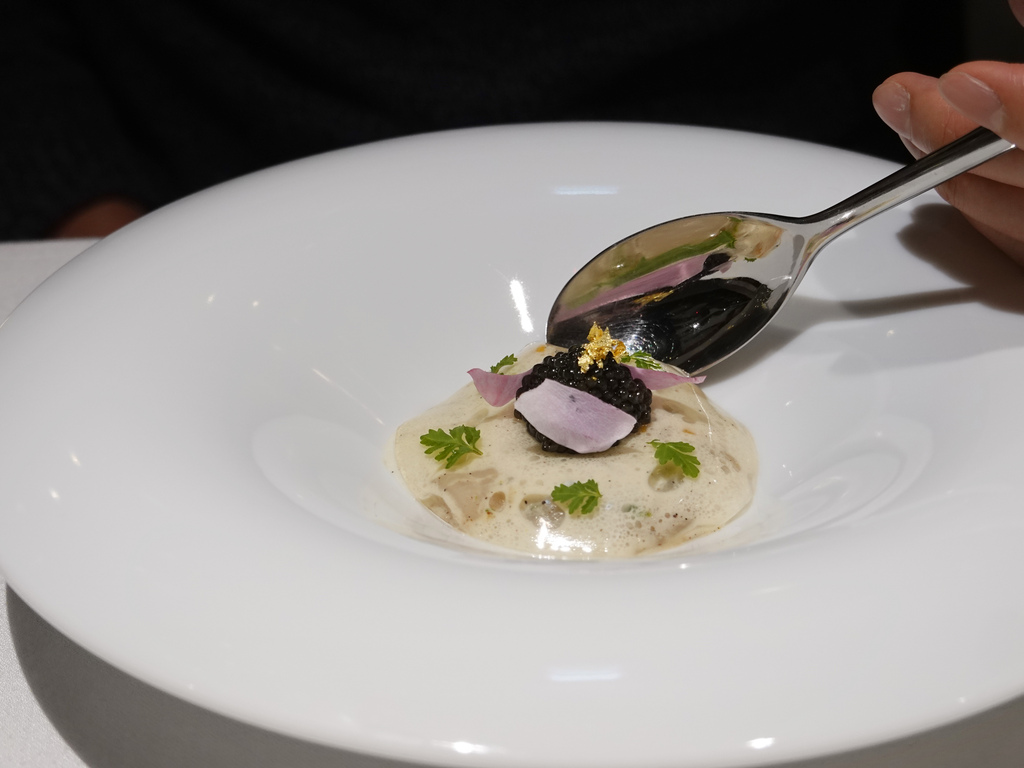 一口吃下,鹹酸甜脆應有盡有,且還帶有起司般馥郁奶味,再喝下一口香檳,濃郁更加提出,第一道就令我印象深刻。