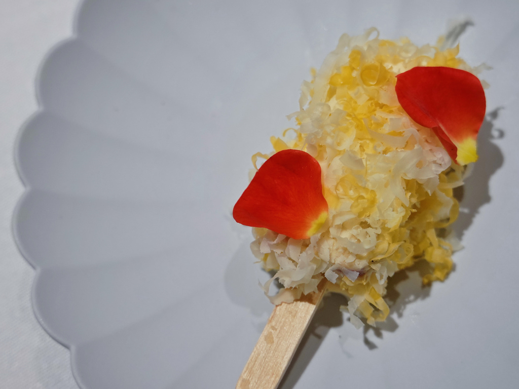 不是傳統的起司拼盤,而是白黴布里乳酪與自製玫瑰果醬,外頭再撒上米莫雷特與康堤起司屑所製成的雪糕。