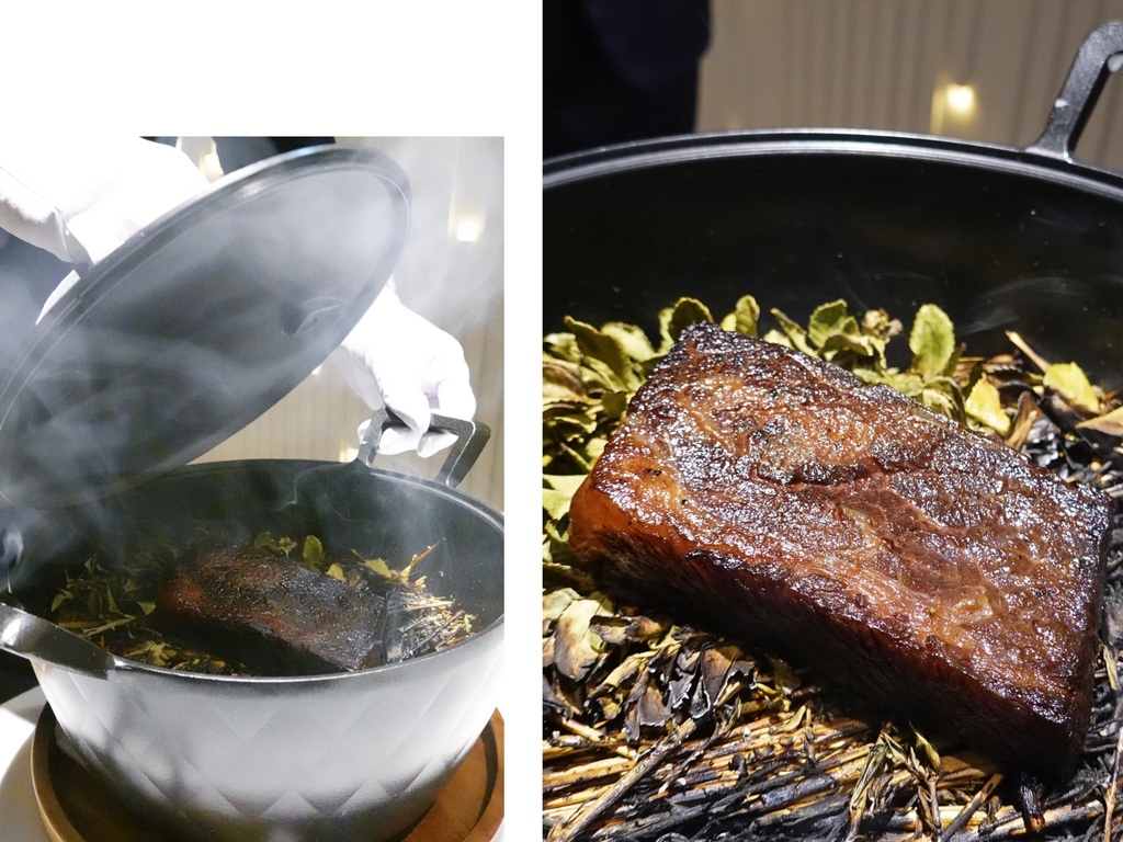 主廚拆解紅酒燉牛肉的手法與食材,先以紅酒高湯低溫烹煮後煎烤,再以稻草煙燻,連在外場都能聞到傳來的陣陣香氣,在嗅覺上很是享受。