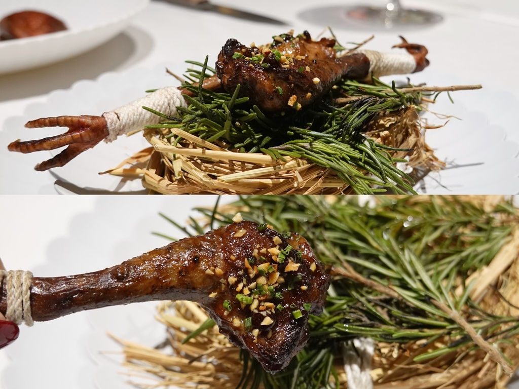 乳鴿腿,則為BBQ照燒風味,可直接拿取線繩纏繞部分啃食,肉質類似小牛胸腺十分柔嫩,帶碳燒香氣,實屬野性珍饈。