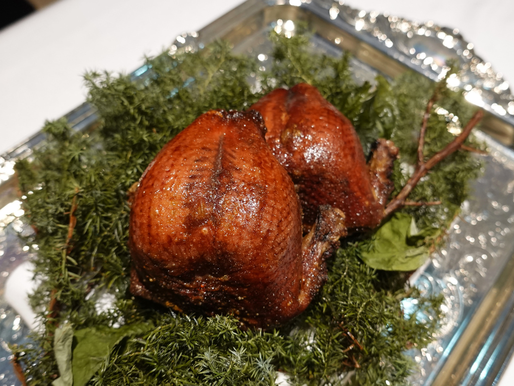 乳鴿,以風乾熟成5-7天,再以油淋方式烹調,將乳鴿胸及乳鴿腿以不同風味呈現。