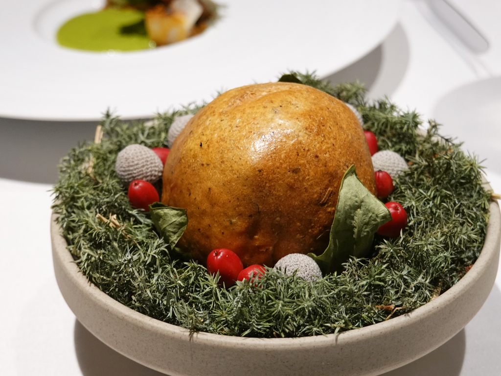 在餐點上桌前,服務生將一顆麵團端上桌,在說明之下,才知道裡頭包覆著的是蕪菁。
