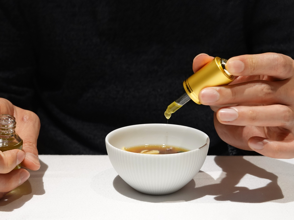 一旁附上的香草風味油可隨喜好添加,能重新賦予湯品嶄新風味,口感更為滑順且尾韻多了草本香氣。