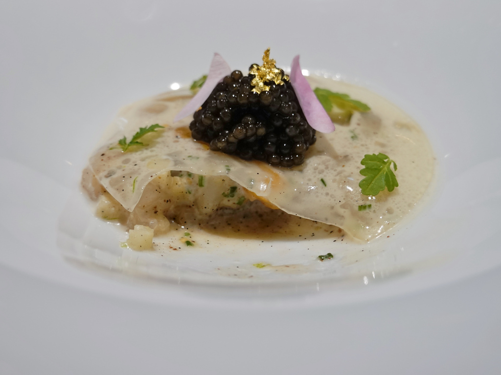 干貝與魚子醬的組合不稀奇,但再加上彰化八卦山的香莢蘭、燈籠果、優格帶出酸香與清爽,將高級法餐提升至精緻法餐。