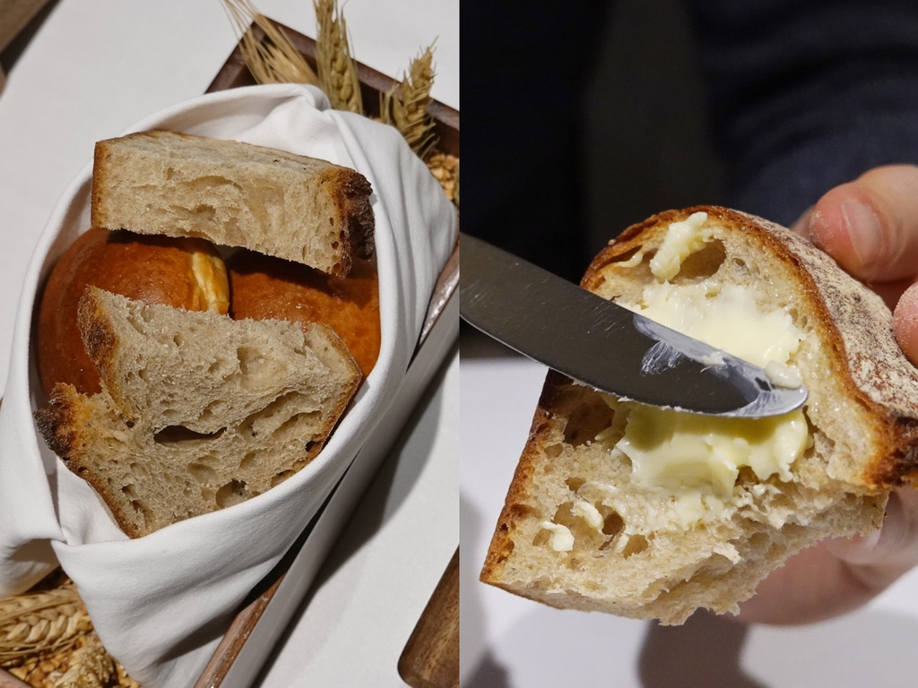 穀物酸種裸麥麵包外酥內Q軟,搭配的是伯迪耶頂級經典手工奶油與鹽之花,香濃滑順。