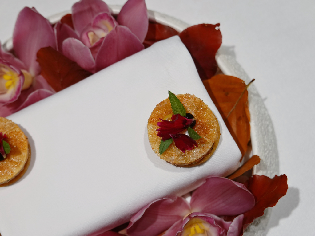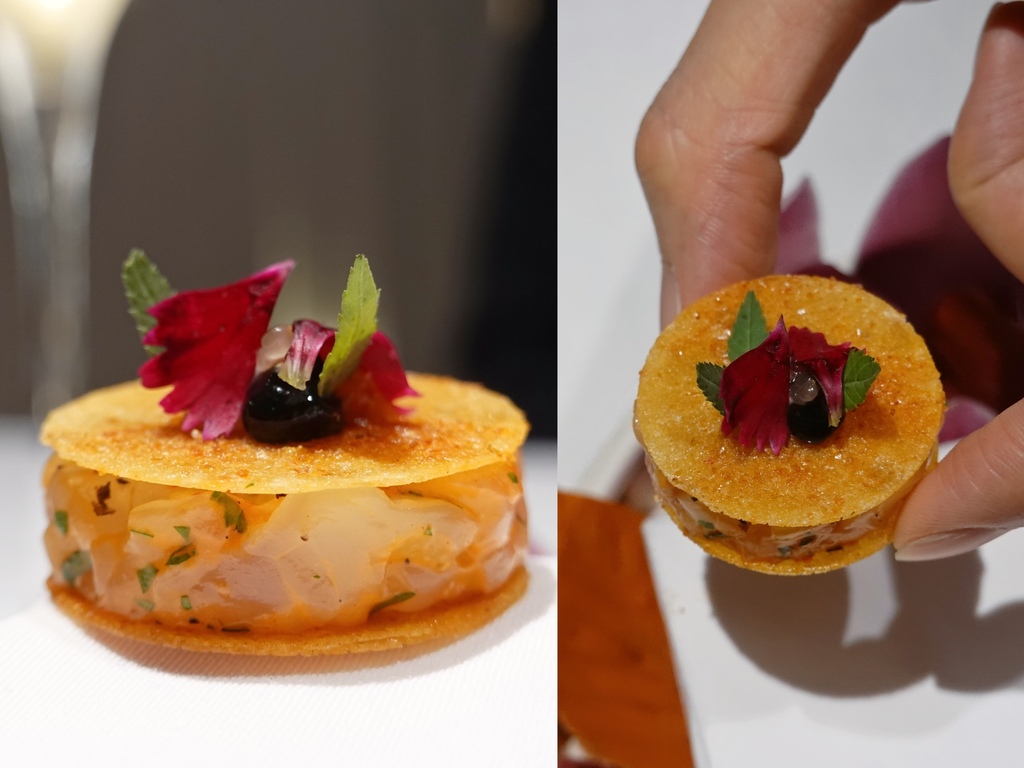 被稱為蝦界和牛的胭脂蝦,主廚Darius將其蝦殼磨成粉後製成薄餅,中間夾層是蝦膏與炙燒蝦身所製成的內餡,完完整整的將胭脂蝦發揮至淋漓盡致。