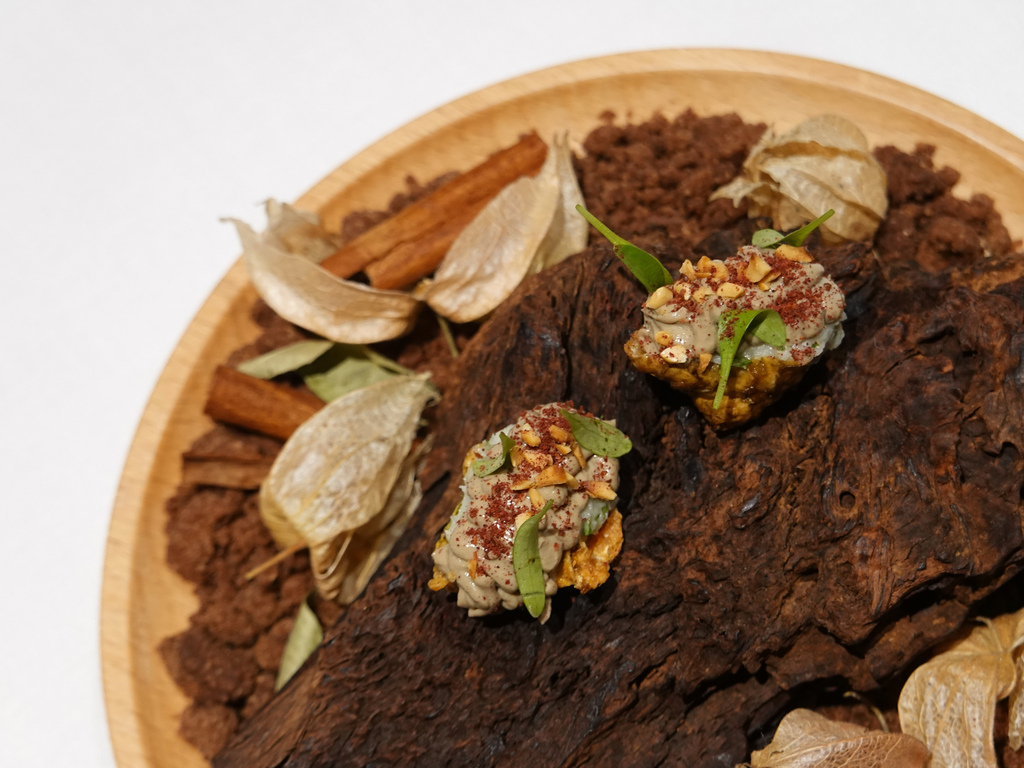 以控土窯手法,將時令蕪菁包裹於香料麵糰中進行悶烤,保留其水分、鮮度與甜度,是出生於高雄的主廚Darius的兒時記憶。