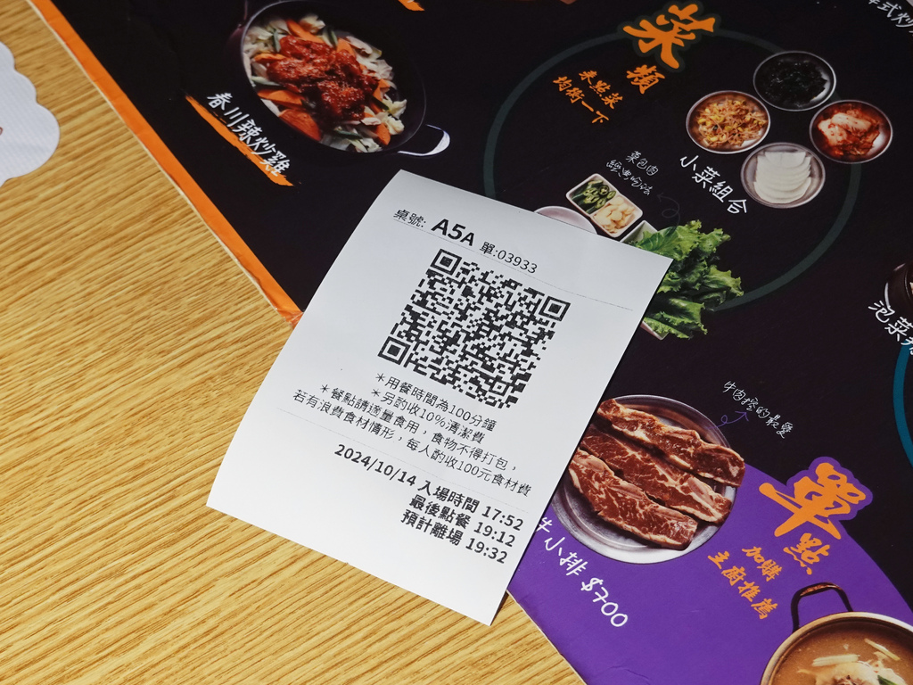 點餐方式是使用QR Code,用餐時間為100分鐘,最後20分鐘不能加點,而每次點餐都要間隔5分鐘。