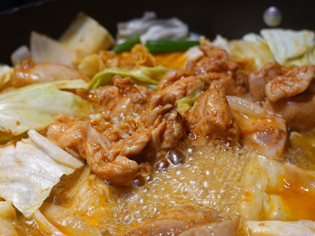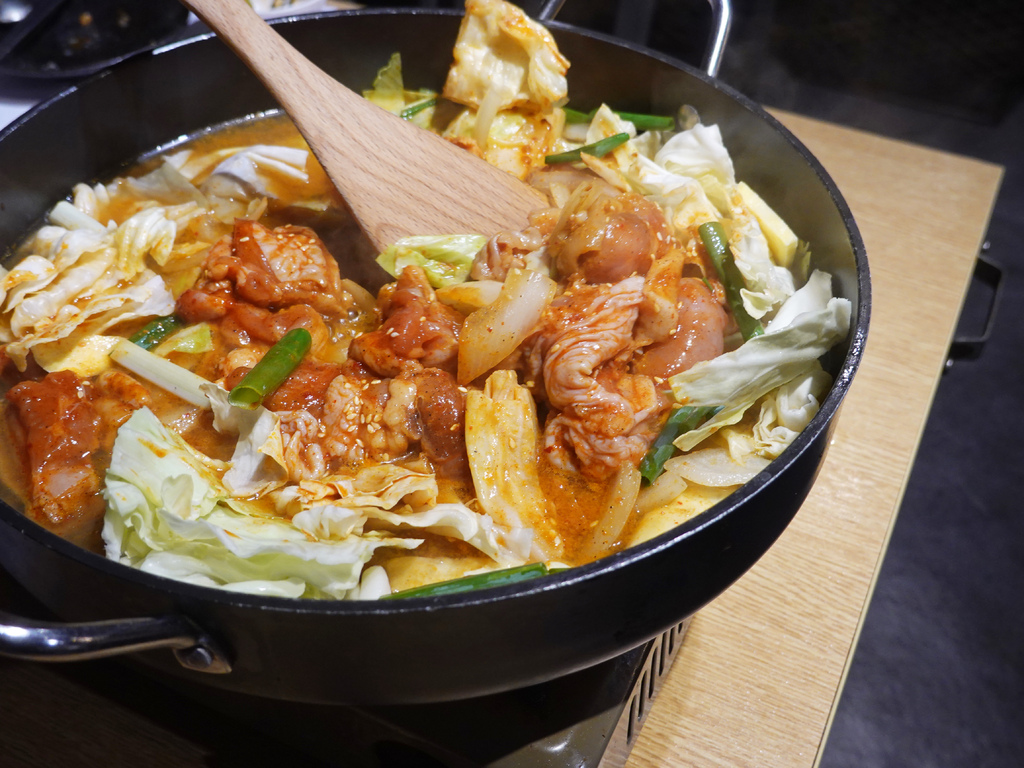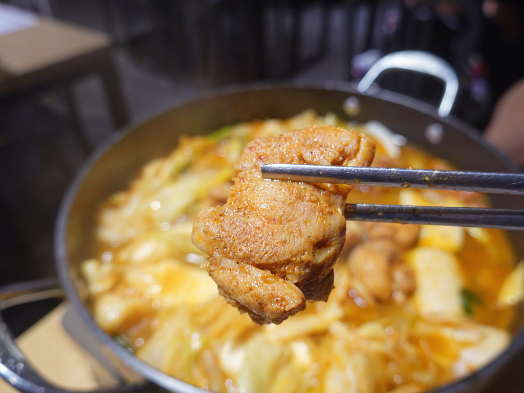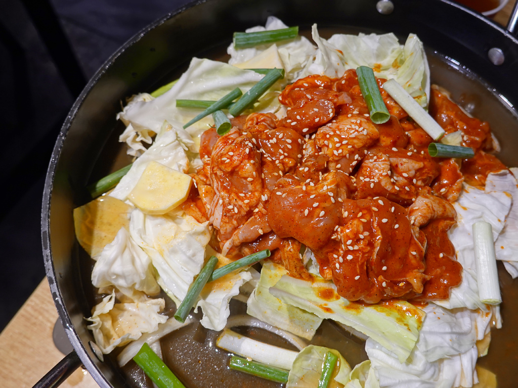 儘管經過前面的兩款烤肉、石鍋拌飯、炸雞、年糕、煎餅,我們兩人已經飽到不行,但看到春川辣炒雞不點說不過去。