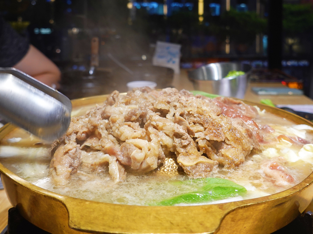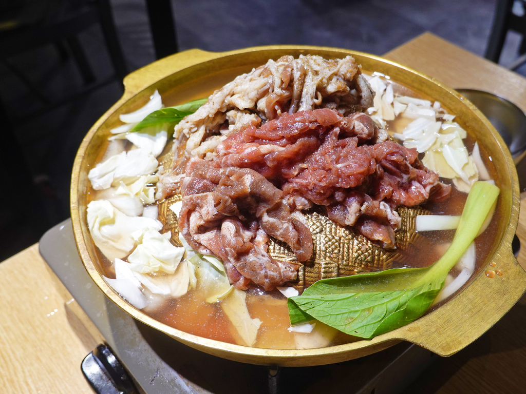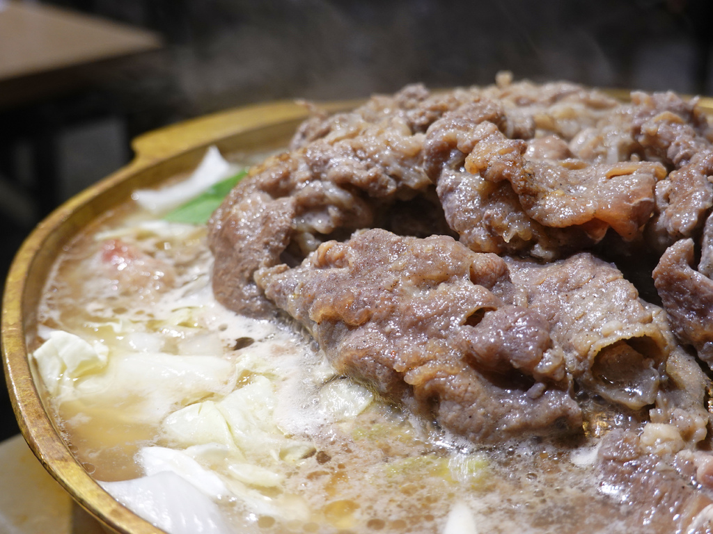 銅盤導熱很快,所以稍微翻炒肉片很快就熟了,肉汁和油脂會流下至高湯,強烈建議加點高麗菜,在熬煮下又軟又甜。
