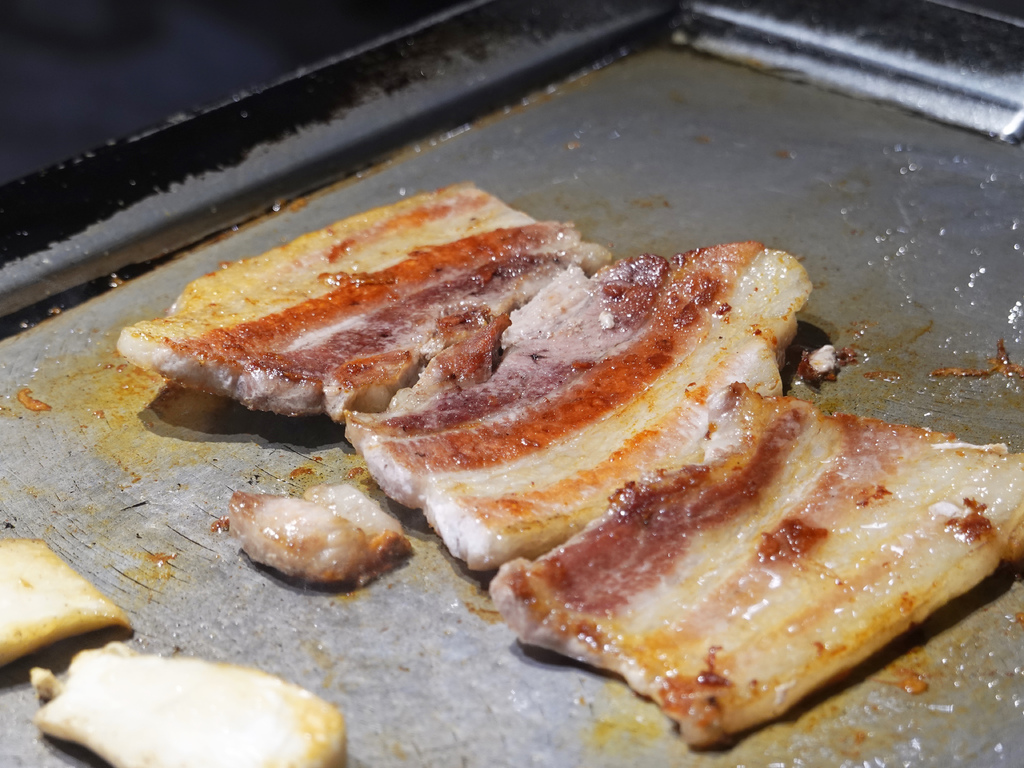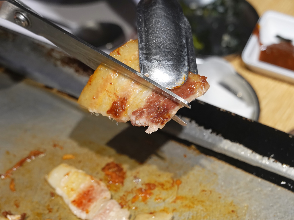 肥瘦相間的豬五花在鐵盤上吱吱作響,煎至雙面金黃後就可以剪成好入口的條狀,口感是酥感跟肉感兼具,單吃也沒有腥味。