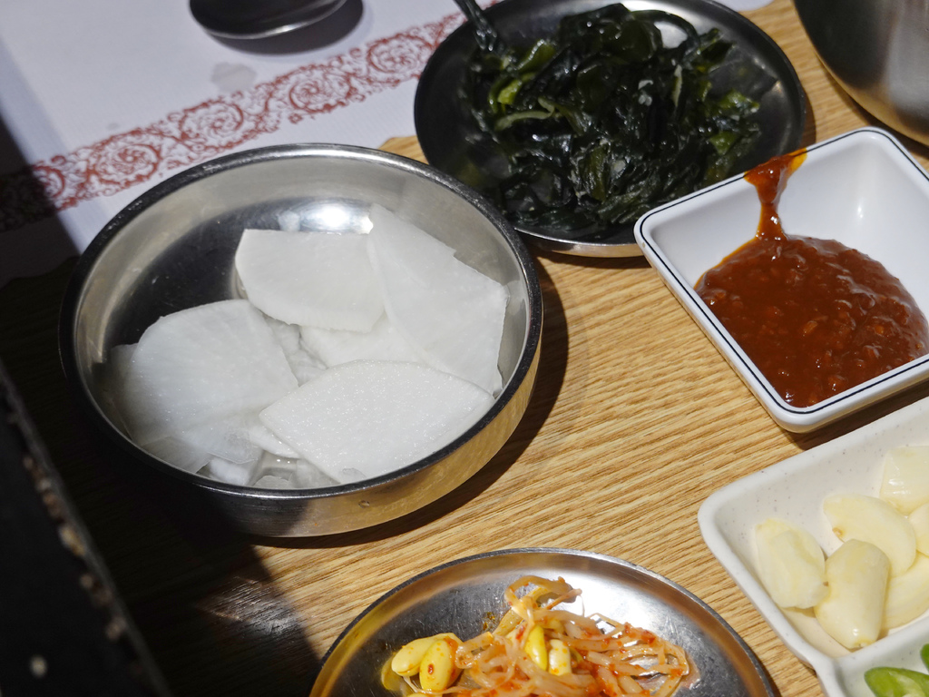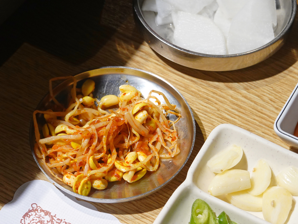 韓式烤肉怎少得了生菜跟小菜,小菜有我最愛的黃豆芽、泡菜、醃漬白蘿蔔還有海帶,光是黃豆芽我就追加了四盤,烤肉吃多了轉換口味超適合。