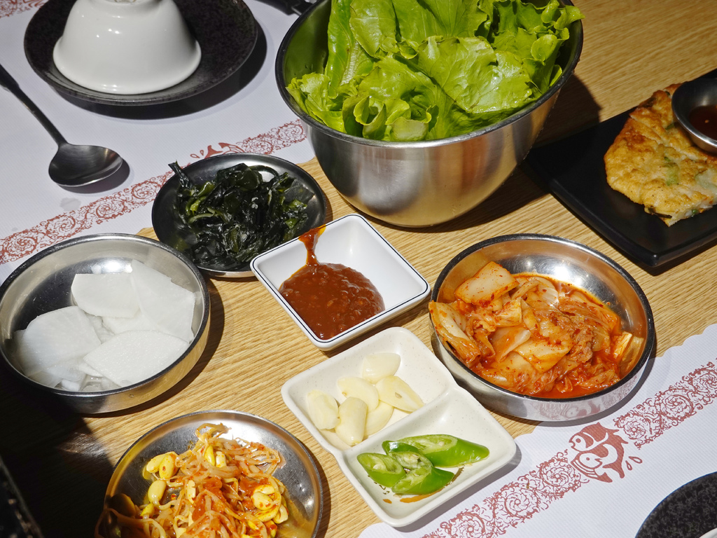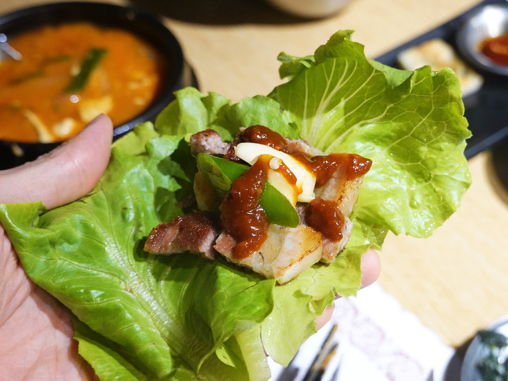當然包進生菜是必須的,吃到飽就是不用小心翼翼的只挾一塊肉,一口氣挾上好幾塊也不會心疼。還可以再依自己喜好包入蒜片、青辣椒片、泡菜,以及韓式沾醬,客製化程度極高,再一大口咬下超滿足超幸福。
