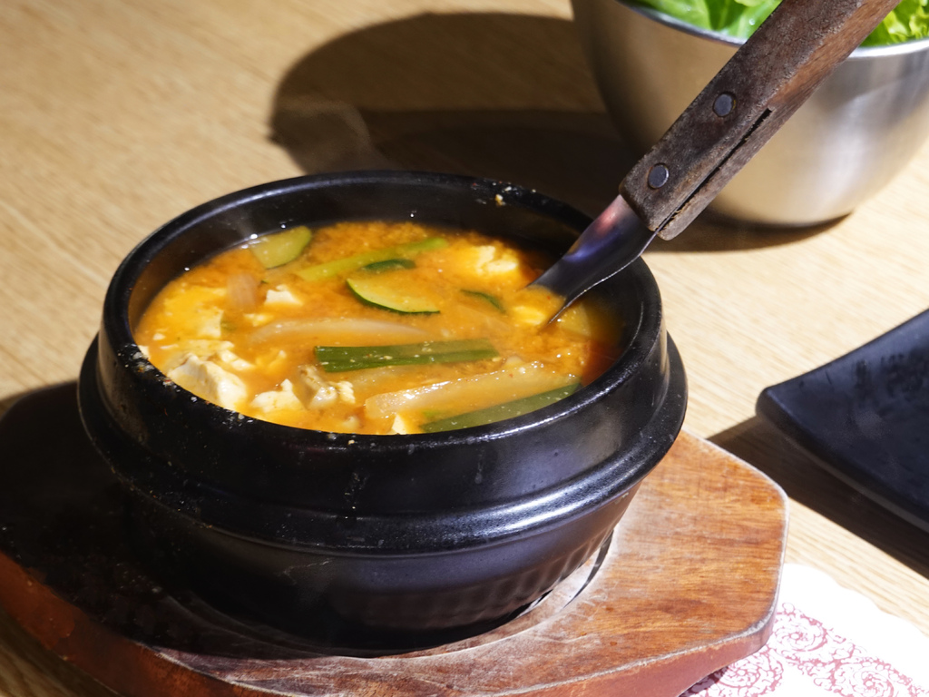 「OKAY 韓國烤肉」提供的湯鍋選項有泡菜辣湯、海鮮豆腐湯、韓式部隊鍋及韓國大醬湯四種。