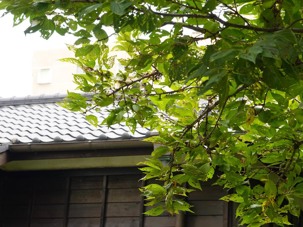 綠意盎然的庭院與黑瓦木構建築相映下有種靜謐的美感。