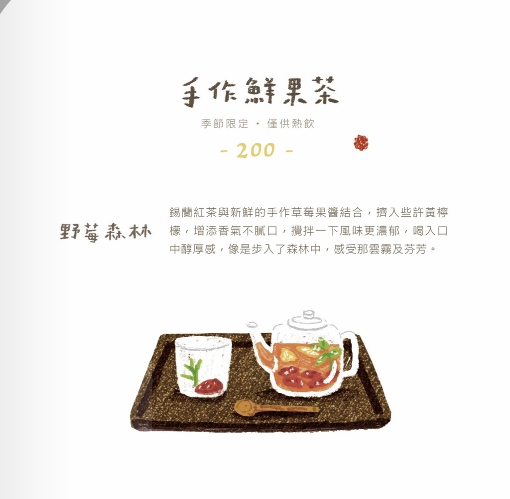 黃檸檬巧妙的中和了甜度,帶有草莓與紅茶的清香與果醬的甜度,最後則是紅茶的微苦澀感收尾,很有誠意的季節限定鮮果茶。