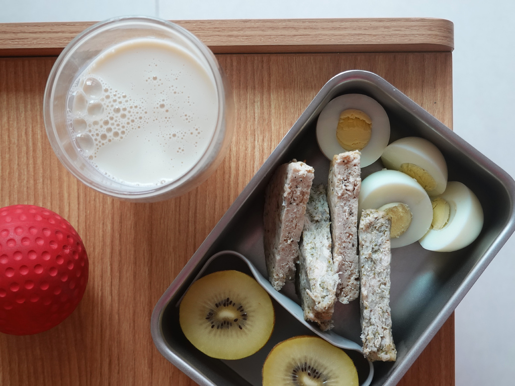這一盒自製健身餐有水果、水煮蛋、減醣漢堡排,加上一杯全豆豆漿,大概是六百卡熱量,蛋白質也高達六十克,已超過我每日應攝取量的一半。