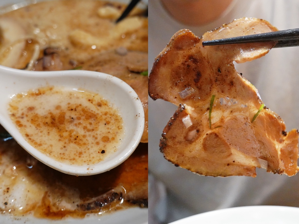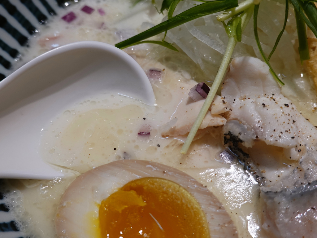 雖說魚酥是店家主打配料,但似乎新鮮度影響口感,潤到甚至需要頻咀嚼,略顯失望,是配料中我最不喜歡的一品,其他配料如海苔、溏心蛋、洋蔥碎、蔥絲等,都有盡到該呈現出的風味。