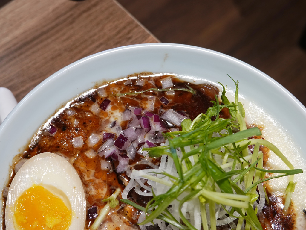 上頭擺放的配料也較一般拉麵來得多,有洋蔥、蔥絲、海苔、魚酥、溏心蛋以及三種肉品,但對我來說,搭配性較豐富程度來得重要。