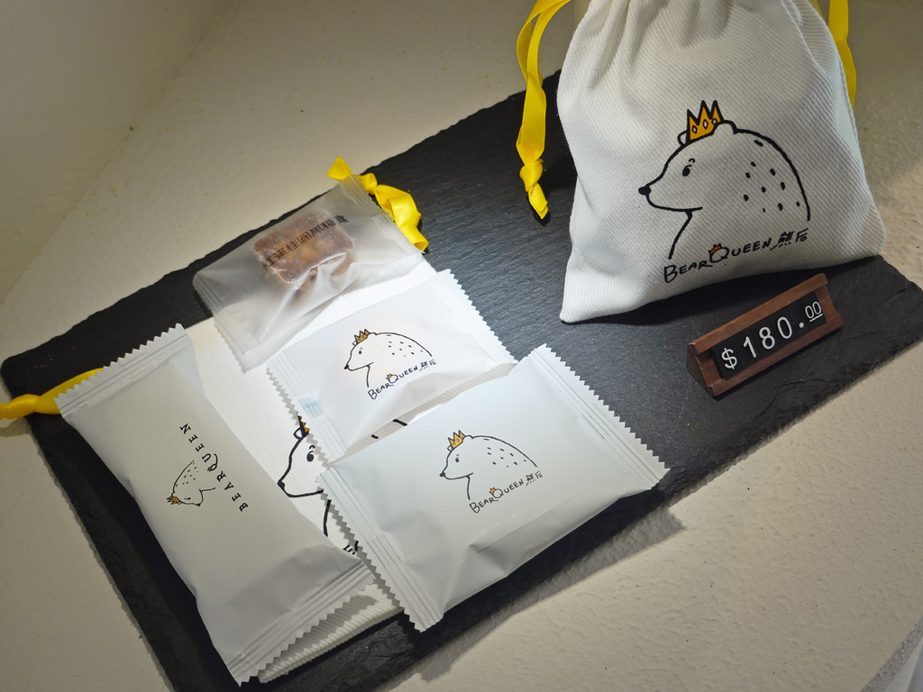 除了禮盒包裝外,「BearQueen 熊后」也很貼心的販售束口袋款試吃組合,可以先購買小包裝試吃全口味,喜歡再購買禮盒,或是當作婚禮小物我覺得也很適合。