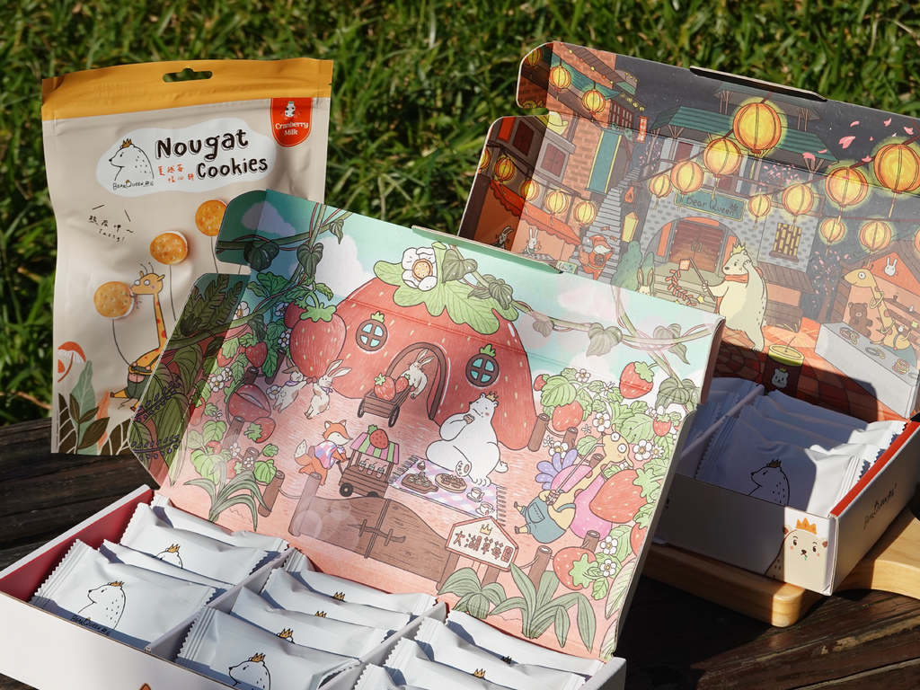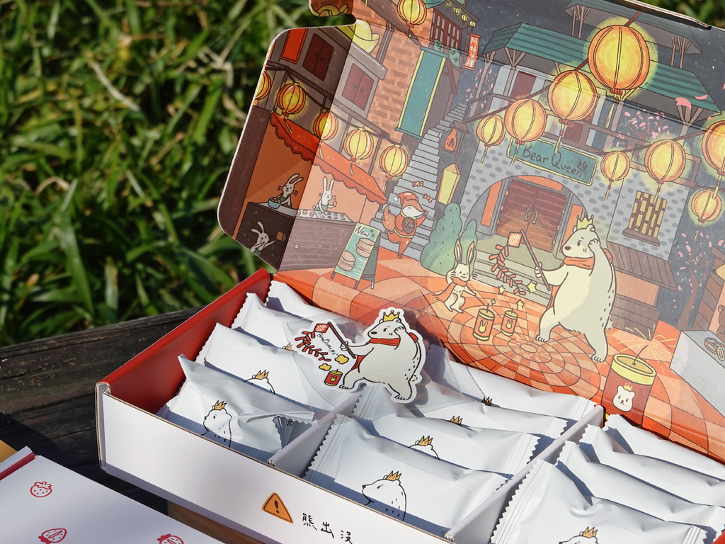 特別為年節設計的禮盒紅得喜氣,還有充滿年節氣氛的童趣插圖,除了禮盒外,內部也有附上一張新年版熊后貼紙,令人一打開就喜愛不已,而如果牛軋餅吃完了,禮盒也能作為置物用。