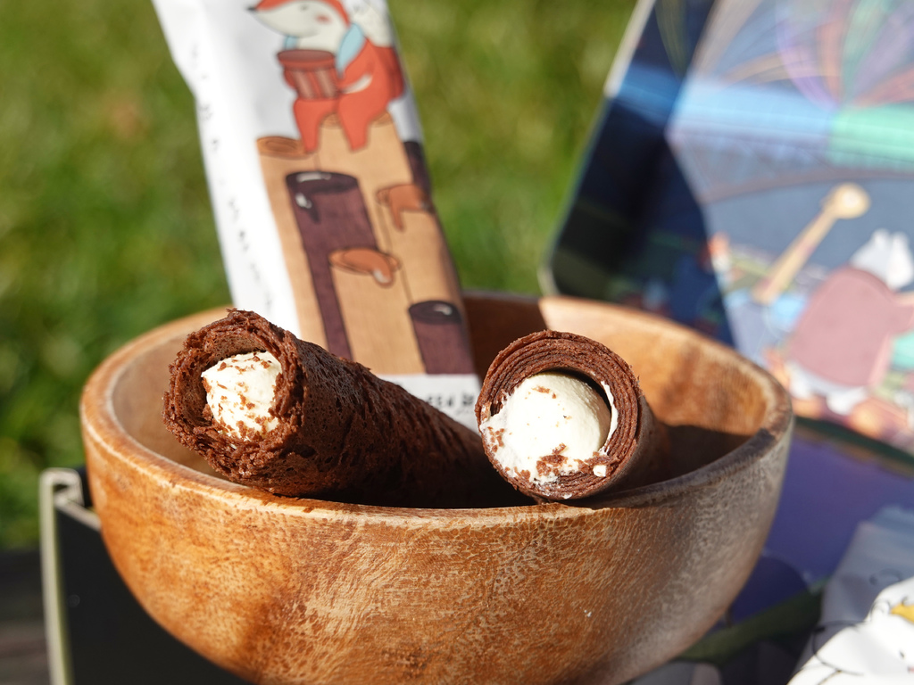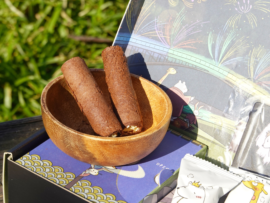 將單獨包裝的塑膠袋撕開,多了承接嬌貴蛋捲的透明殼,原以為蛋捲屬扎實型,咬下竟意外地新鮮薄脆,且由於是選用荷蘭頂級75%巧克力,是屬大人的苦甜口味。