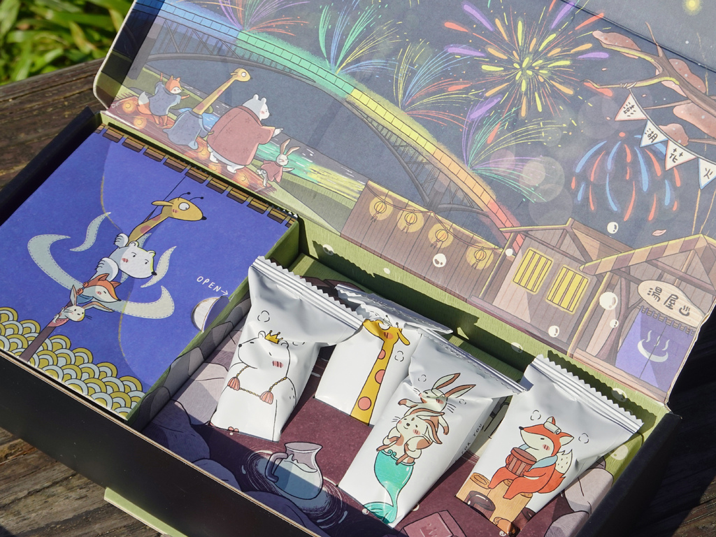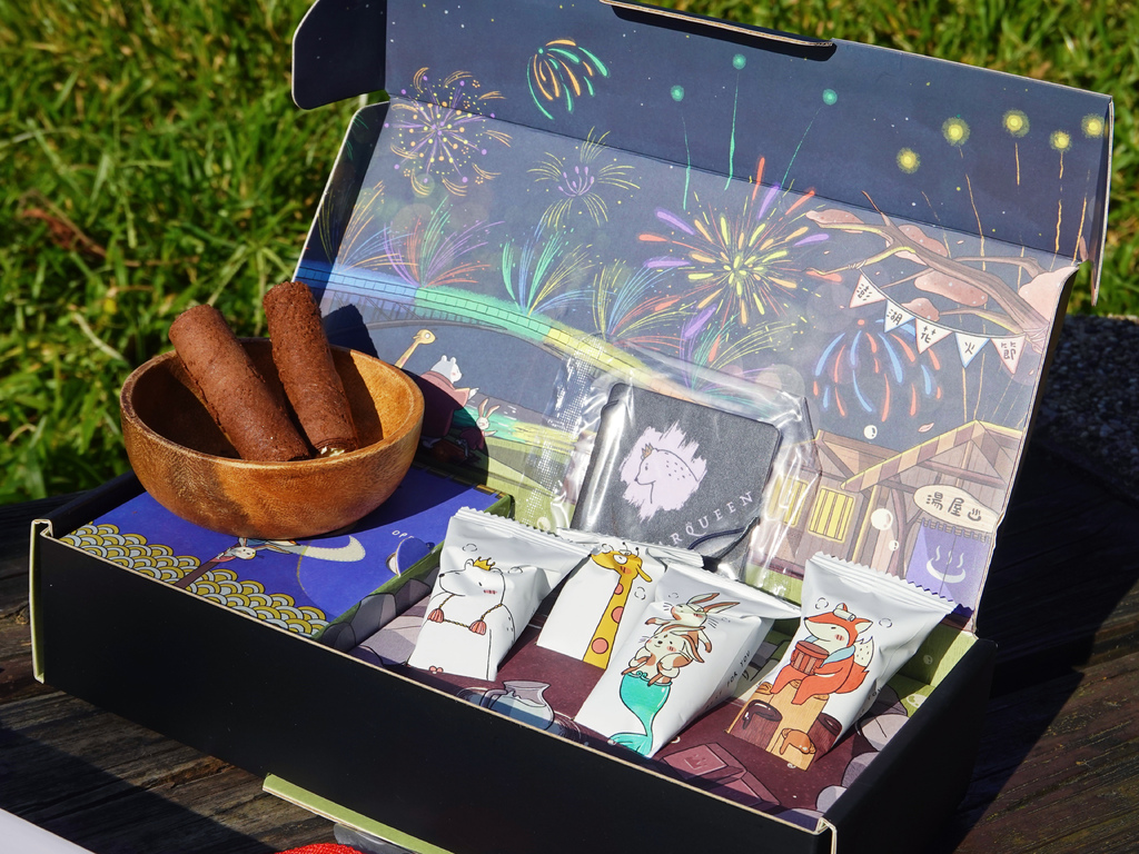 揮別白色為底的「BearQueen 熊后」禮盒設計,改採巧克力的暗色系,更顯沉穩低調,一打開禮盒,則是反差的煙火大會,下方是四款動物彩繪的包裝,其餘六根則是放在盒子中,活潑童趣很是討喜。