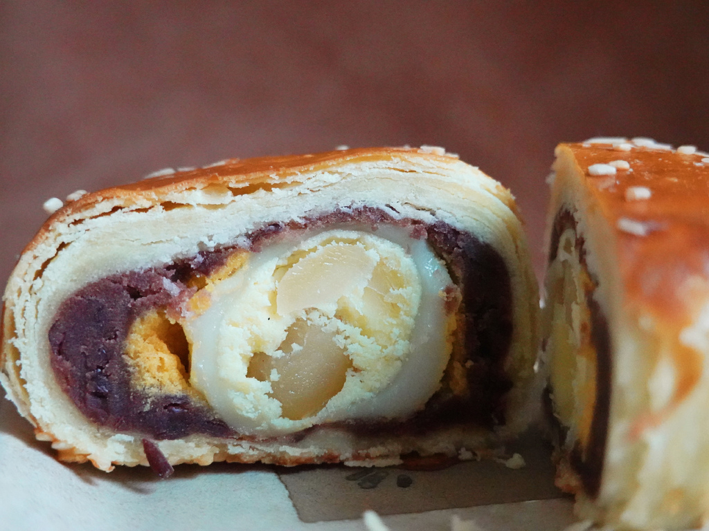 最外層是以古法製作的油酥皮,萬丹小紅豆甜度低且綿密細緻,奶酥的甜而不膩與鹹蛋黃的鹹香結合恰到好處,麻糬也沒有因為冷藏而變硬,Q嫩好入口,我最喜愛的夏威夷豆則包裹在最中心,脆口且飽富油脂香氣。