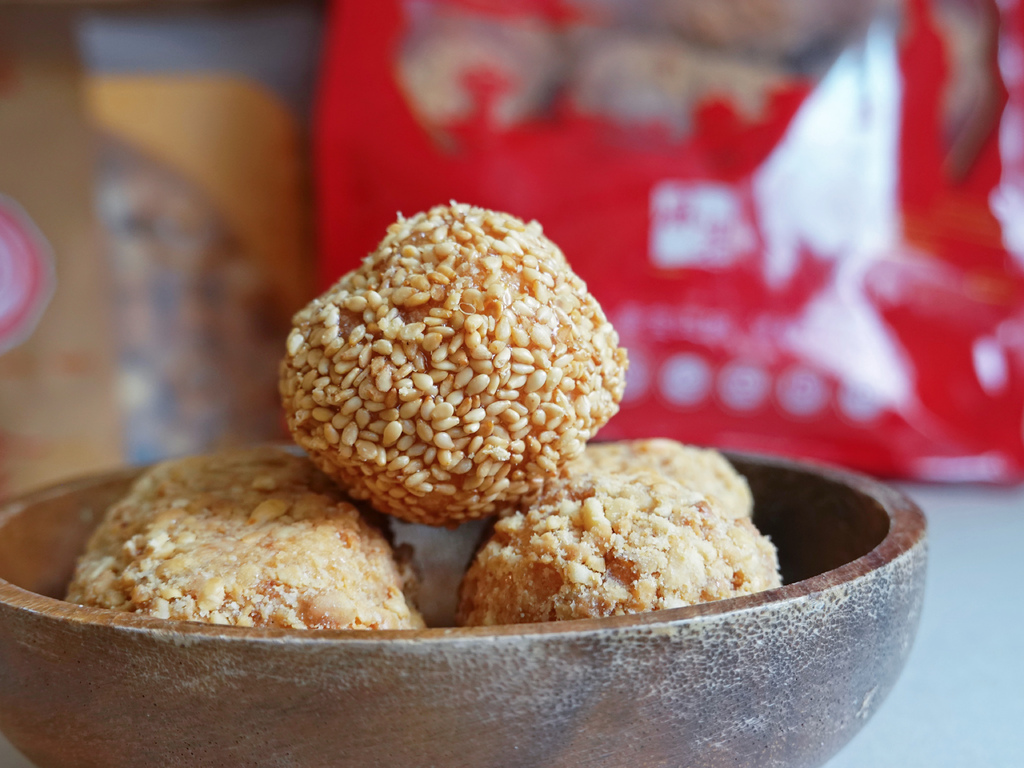 每個麻荖都是不規則的形狀,先是裹上薄薄一層麥芽糖衣,再沾附滿滿的芝麻或是花生粒,用料很是實在。