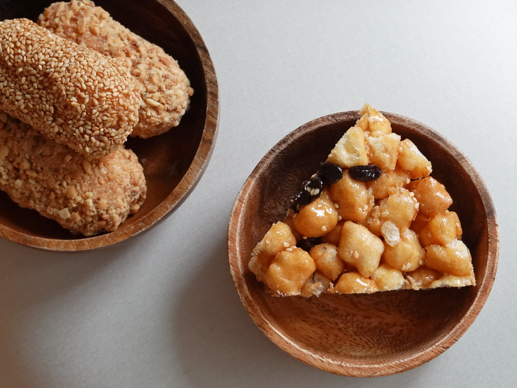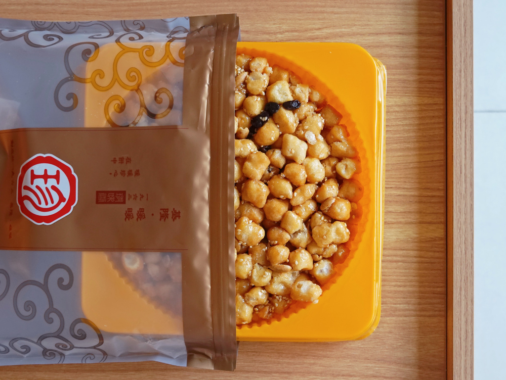 以手工製作的沙其馬,主要食材是麵粉跟蛋,「珍味香餅家」更是以全蛋製作,不添加一滴水,使口感兼具酥、鬆、軟,蛋香也更為濃郁,除此之外,花生與葡萄乾的點綴,增添了酸度與脆口,麥芽糖依舊不黏牙不死甜。