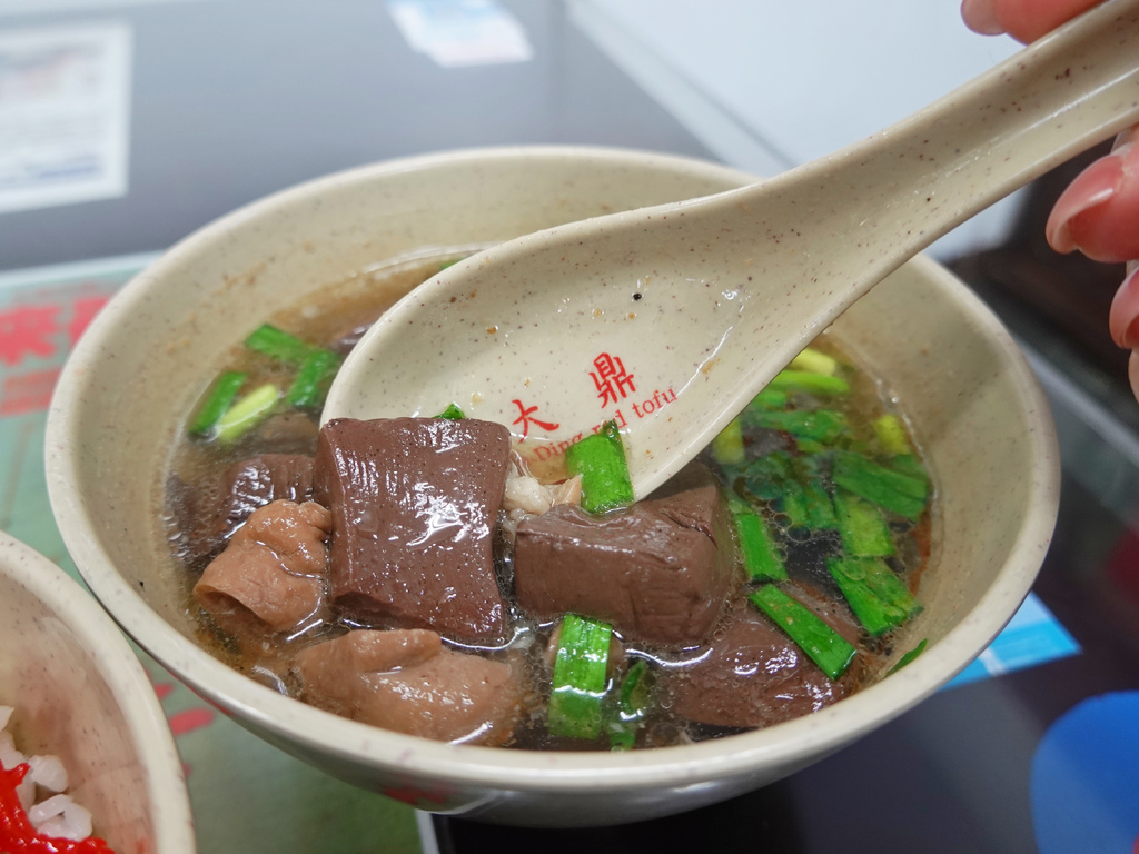 之前在台南吃到的「聖記軟骨飯」就很合我胃口, 相較起「聖記軟骨飯」的清燉軟爛,「大鼎豬血湯」則是以醬油滷製,瘦肉部分也偏多些,對我來說雖口感不錯,但鹹度偏高。